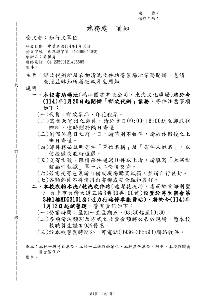 郵政代辦所及衣物清洗收件站營業場地業務開辦通知